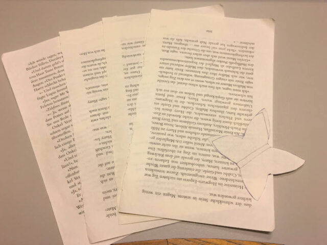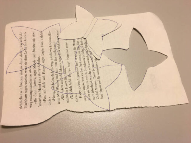Für die Schmetterlinge habe ich zuerst eine einfache Schmetterlingsform auf der rausgerissenen Buchseite vorgezeichnet und ausgeschnitten. Diese habe ich dann als Vorlage genutzt. Ihr könnt natürlich auch im Internet nach Schmetterlings-Vorlagen suchen. Dann legt ihr diese Vorlage einfach auf die Seite legen und zeichnet sie ab. Wenn ihr die Vorlage auf einen Karton klebt und ausschneidet, dann können auch jüngere Kinder sie gut zum nachfahren verwenden. Die ausgeschnittenen Formen legt ihr dann immer paarweise zusammen. Wenn ihr daraus einen Schmetterling faltet, bleibt in der Mitte ein flacher Streifen übrig. Dort kann man dann gut den Klebstoff auftragen und die Schmetterlingsflügel auf den unteren Schmetterling kleben. So ergibt sich ein schöner Flatter-Effekt.