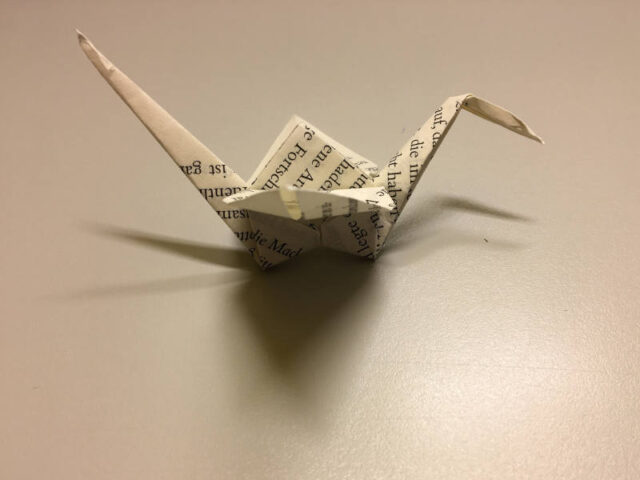 Origami ist ja schon eine ziemlich hohe Stufe der Fingerfertigkeit, besonders, wenn man es mit kleineren Büchern zu tun hat. Doch da die Glückskraniche einfach schön sind und meine Kollegin sehr geschickt im Origami falten haben wir es ausprobiert. Sie hat für unsere Deko ein paar gefaltete Kraniche beigesteuert. Ich kann nicht wirklich erklären wie, aber im Internet findet man ja Erklärungen für alles. Hier findet ihr eine Anleitung für euren eigenen Origami Kranich. Und aus solchen Papier-Kranichen könnt ihr mit Kettelstiften, Ösen und Ohrhakerln ganz schnell Ohringe machen.