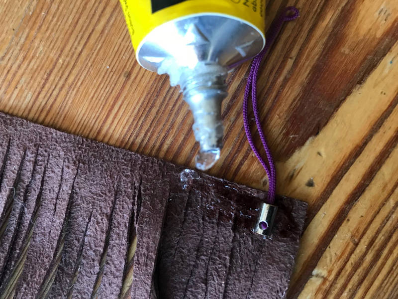 - Bereitet dann eine nette Schnur vor, die ihr in die Mitte des eingeschnittenen Lederrestes gebt und dort festklebt.