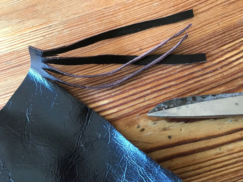 - Schneidet in das Leder dünne Streifen hinein. Achtung, nicht ganz durchschneiden sondern oben 2-3 cm (je nach Größe des Endstückes) frei lassen.
