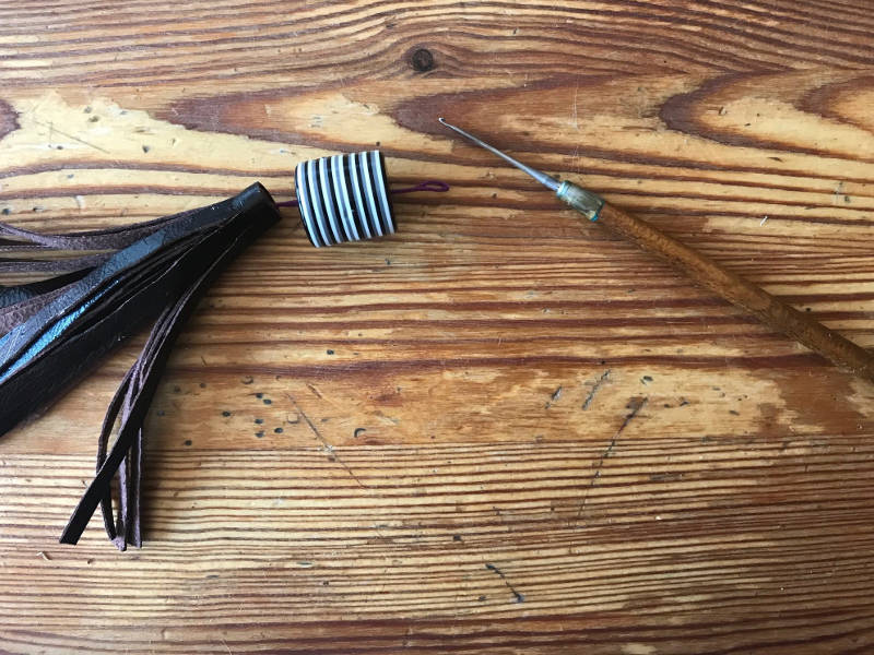 - Danach muss der zusammengerollte Lederrest in die Perle hineingefädelt und angeklebt werden. Da die Perle auf der einen Seite nur ein kleines Loch hatte, haben wir mit einer Häkelnadel den Faden durchgefädelt.