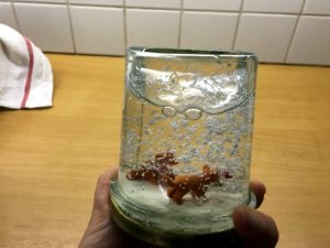 • einen Tropfen Spülmittel – sonst wird das Wasser trübe, wie ihr oben bei der Fimo-Figur seht