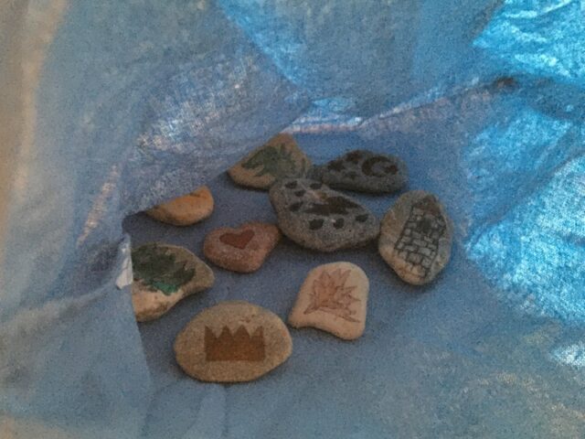 Jetzt kann es los gehen mit dem Geschichten erfinden. Am besten fangt ihr an mit einem klassischen „Es war einmal …“, dann zieht ihr den ersten Stein aus dem Stoffbeutel. Das Motiv auf dem Stein sollte jetzt in die Geschichte eingebaut werden. Wenn ihr nicht mehr weiter wisst dann zieht ihr den nächsten Stein. Eine Geschichte kann man auch gut zusammen erfinden, dafür zieht man immer nacheinander einen Stein und erzählt die Geschichte da weiter wo zuvor aufgehört wurde.