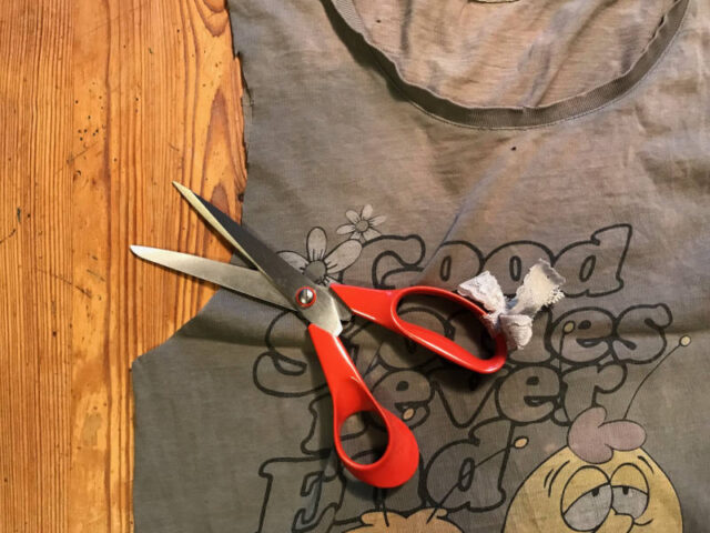 Dazu benötigt ihr lediglich ein kaputtes T-Shirt und eine Schere. Wer es gerne ordentlich und genau machen will, sollte sich auch ein Maßband und ein Kreide besorgen.