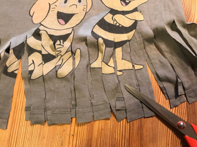 - Dann schneidet ihr von unten den Stoff in ca. 3 cm breite Streifen. Diese Streifen sollten ca. zehn Zentimeter lang sein und vorne und hinten recht gleichmäßig verteilt sein, also idealerweise alle gleich breit und gleich lang. Wer genau arbeiten möchte, kann sich das auch mit einer Kreide anzeichnen, wir haben es ohne gemacht, da das Prinzip recht einfach ist.