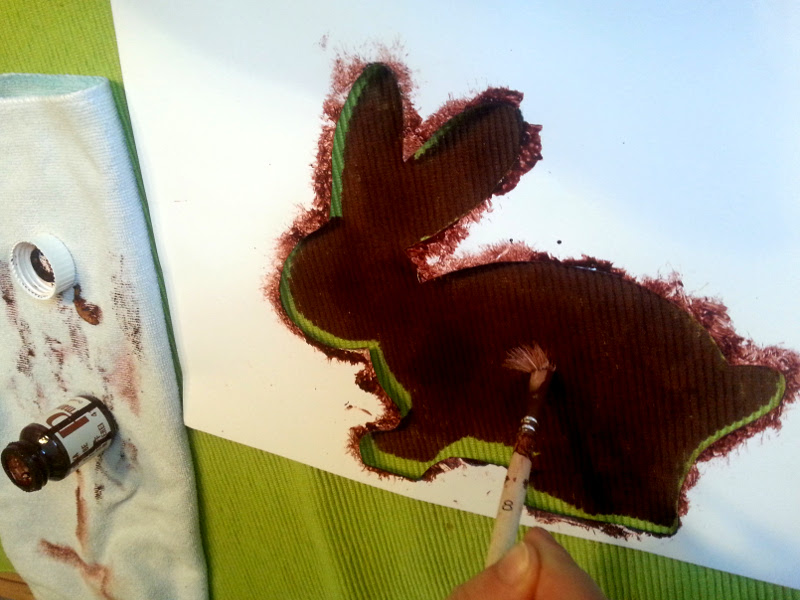 Mit der Hasenschablone tupft oder malt ihr den Hasen auf die Tischdecke.