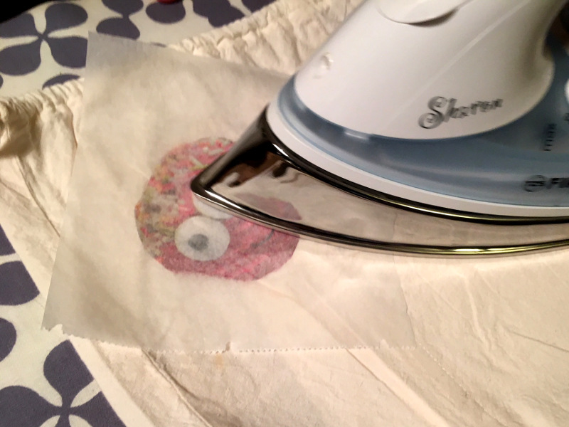 - Als nächstes richtet ihr euch Bügelbrett, Sackerl und Bügeleisen her, legt das Motiv auf das Sackerl und gebt ein Backpapier in passender Größe drüber.