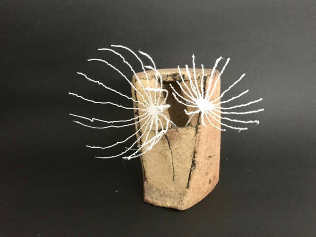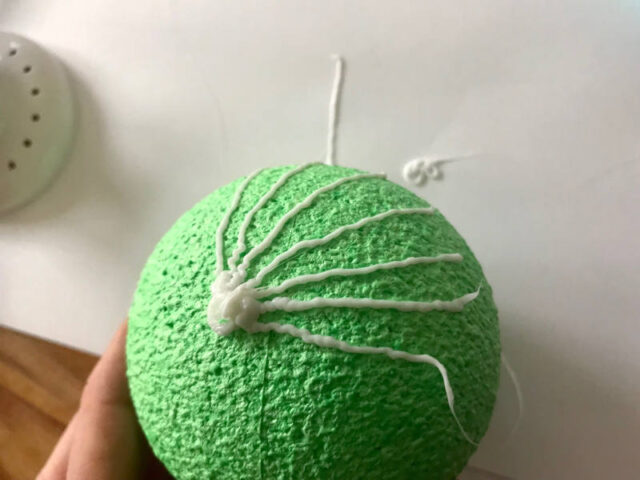 Diese Blumen erinnern an die Samen des Löwenzahns. Dafür benötigt ihr weißes Filament, das ihr mit dem Stift über einen Ball zieht. Unser Ball hatte in etwa die Größe eines Tennisballs und war hart. Da ging das getrocknete Filament auch gut ab. Aber das testet ihr am besten zuerst. Als nächstes haben wir einen Stil gemacht, der etwas dicker war, weil er ja die Blumen tragen sollte. Dafür sind wir den Strich mehrmals entlang gefahren. Nachdem wir die abstehenden Fäden abgeschnitten hatten, haben wir den Stil an der liegenden Blume befestigt. Dass die Linien etwas zittrig waren, hat hier richtig gut gewirkt.