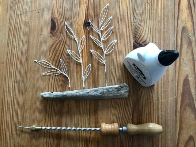 Als nächstes haben wir Blätter-Blumen gebastelt. Dafür wurden zuerst einzelne Blätter gemacht, gefolgt vom Stil. Als nächstes haben wir die Blätter wieder mit Filament am Stil befestigt. Diesmal hatten wir ein schönes Treibholz, das gut dazu gepasst hat. Darin haben wir mit dem Handbohrer kleine Löcher gebohrt und dann die Zweige mit Kleber hinein geklebt. Einzelne Blätter haben wir auch versucht, an einem Zweig zu befestigen. Das sieht zwar wunderschön aus, aber es war nicht ganz so haltbar wir die reinen Filament-Gebilde.