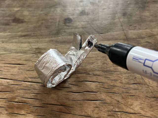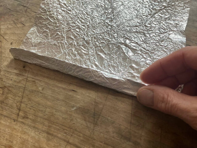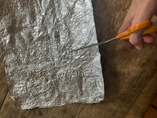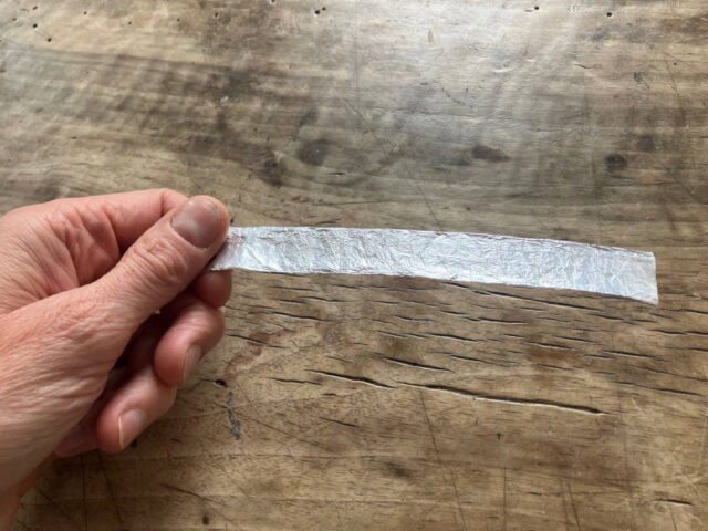 - Dann faltet ihr die Folie in eine Richtung mehrmals übereinander in einer Breite von ca. 1,5cm bis ihr einen Streifen habt, der einem Aluminium-Blechstreifen ziemlich nahe kommt.