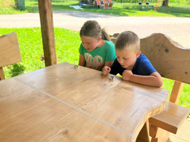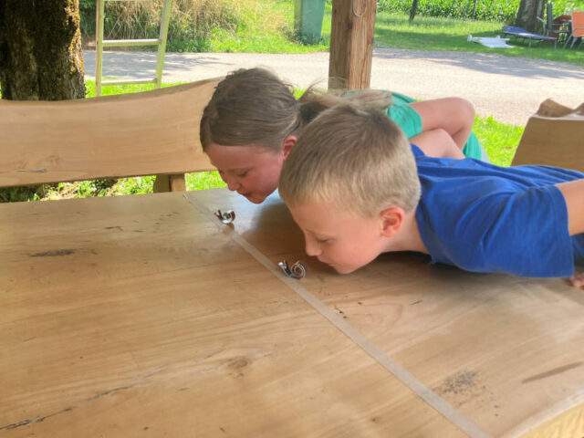 Dafür braucht ihr natürlich mehrere Schnecken und einen Tisch mit einer freien Fläche von ca. 1,5m Länge. Bei einem langen Tisch könnt ihr eine Strecke bei 1 oder 1,5m mit einer Linie quer über den Tisch markieren, z.B. mit einem Klebeband oder zwei Kinder/Erwachsene halten eine Schnur gespannt.
