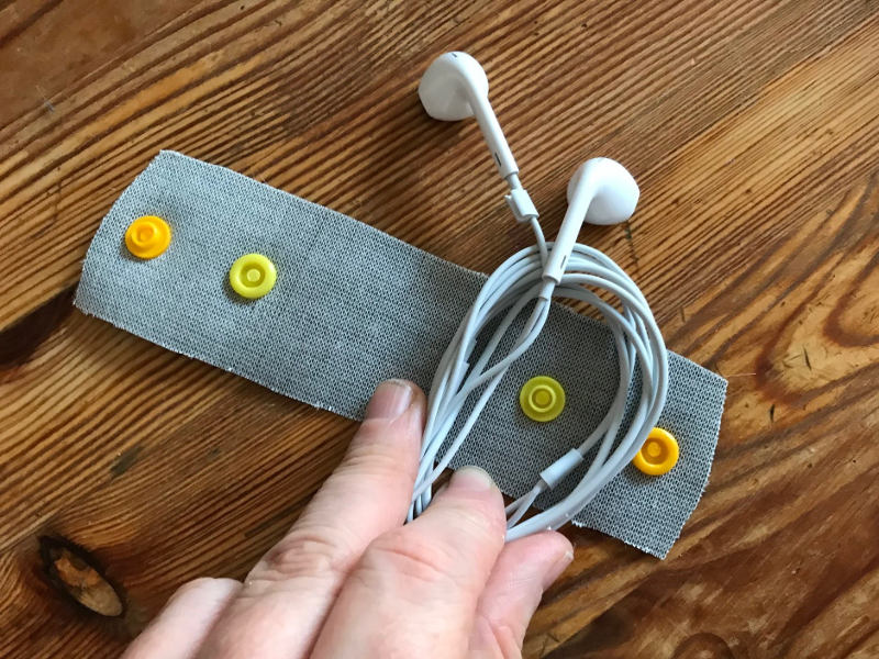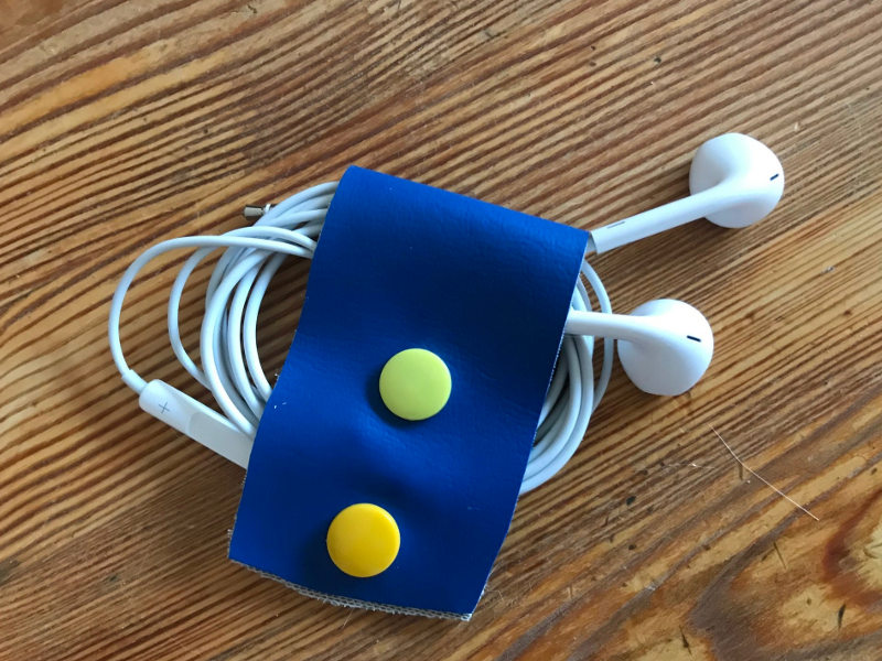 - Wenn ihr noch einen zweiten Druckknopf anbringen wollt, achtet darauf, dass ihr genug Platz zwischen den beiden Knöpfen für´s Kabel freilasst. Am Besten ihr wickelt es kurz auf und macht einen Versuch bevor ihr wieder mit dem Druckknopf den Kunststoff durchstecht.