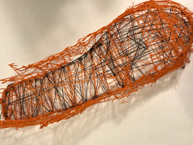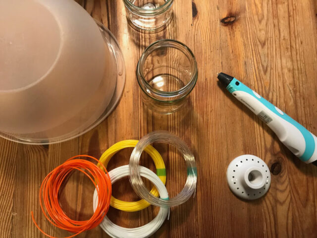 Im Prinzip kann man ihn mit einer Heißklebepistole vergleichen, bei der statt Klebstoff ein Plastikfaden herauskommt, der sehr schnell auskühlt und hart wird. Man kann in alle Richtungen zeichnen und es gibt auch Schablonen und Vorlagen. Damit kann man dreidimensinale Gebilde machen. Das Filament, also die Füllmasse, gibt es in vielen verschiedenen Farben.