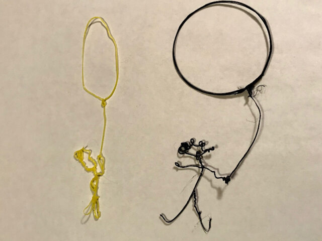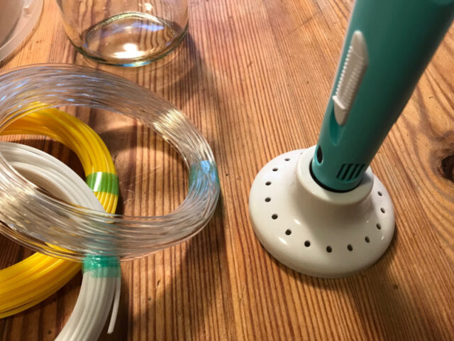 Unser Stift ist nicht die teuerste Variante und wenn ich mir im Internet Videos anschaue, bei denen der Faden aus dem Stift so sanft und gleichmäßig zu laufen scheint, dann kann es an unserem Können oder am Stift liegen.