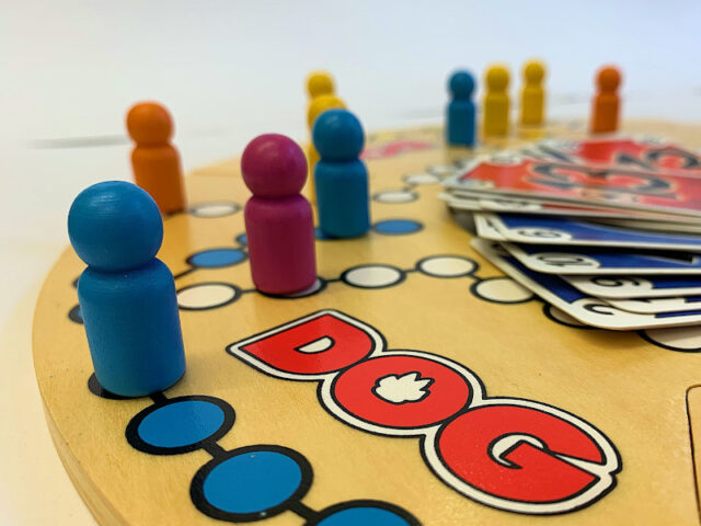 Es hat zwar keine Würfel, aber Dog ist trotzdem jedem „Mensch ärgere dich nicht“-Fan, wärmstens ans Herz zu legen, denn es ist genau wie „Mensch ärgere dich nicht“, aber mit Karten. Ohne Würfel wird das Spiel etwas taktischer, weil die Spieler_innen selbst aussuchen, welche Karte sie ausspielen, statt zu würfeln. Bei einer geraden Spieler_innen-Anzahl könnt ihr auch in Teams spielen, dann ist ein bisschen Teamwork mit dabei.