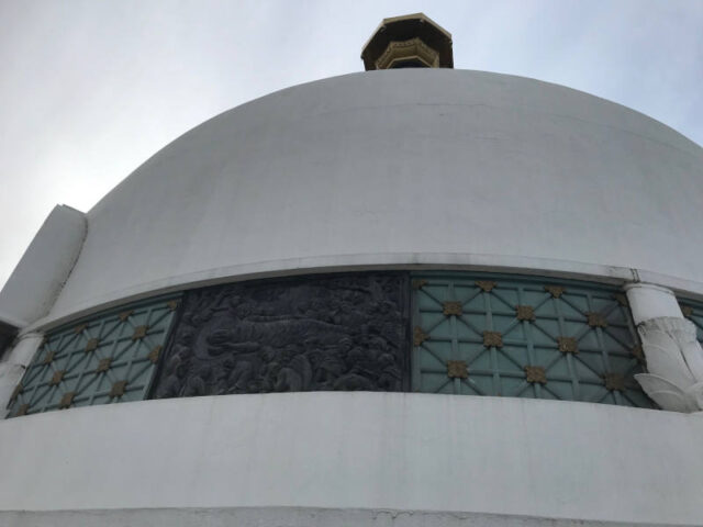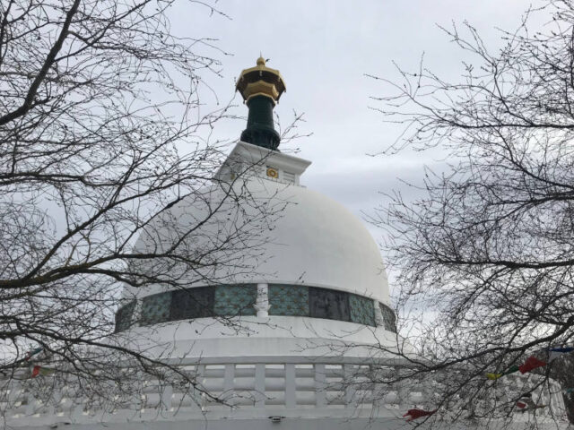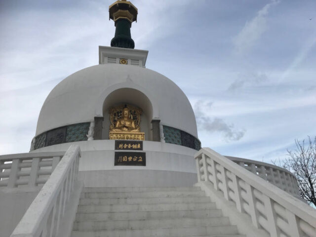 Übrigens gibt es auf der ganzen Welt solche Friedenspagoden. Sie wurden unter der Leitung von Nichidatsu Fujii (1885–1985) gebaut, einem Mönch aus Japan. Ihn hat ein Treffen mit Mahatma Gandhi dazu inspiriert. Die ersten Friedenspagoden wurden 1947 in den japanischen Städten Hiroshima und Nagasaki gebaut.