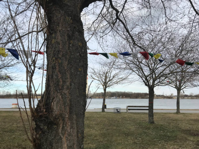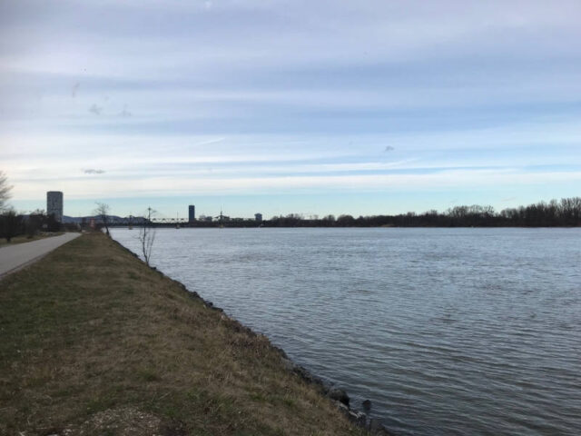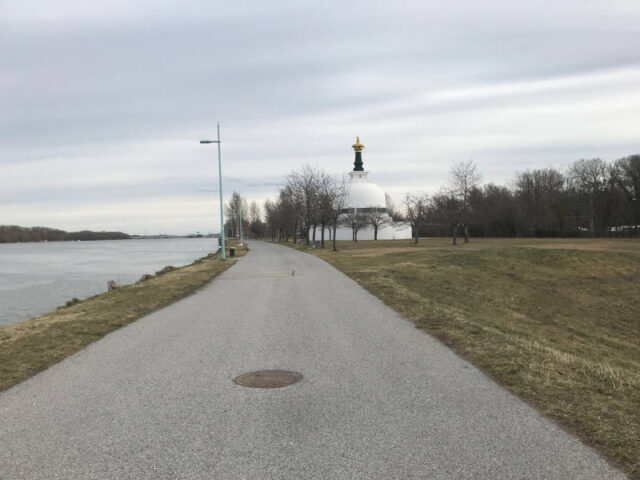Eine Friedenspagode soll an den Weltfrieden erinnern und die Botschaft von Mitgefühl und friedlicher Koexistenz verkünden. Sie soll dazu beitragen, dass alle Menschen gemeinsam nach Frieden auf der Welt streben und das unabhängig von ihrer Glaubensrichtung. Auch wenn jetzt im Winter noch nichts blüht und die Ufer und Bäume kahl sind, so ist etwas von diesem Friedensanliegen dort spürbar. Und das nicht nur, weil Gebetsfahnen in den Bäumen wehen. Vielleicht ist es eine Atmosphäre, die sich an einem solchen Ort manifestiert, wo immer wieder Zeremonien für den Frieden stattfinden. Wir haben den Blick auf die Donau genossen, das Unspektakuläre des Stupas, den Frieden dort.
