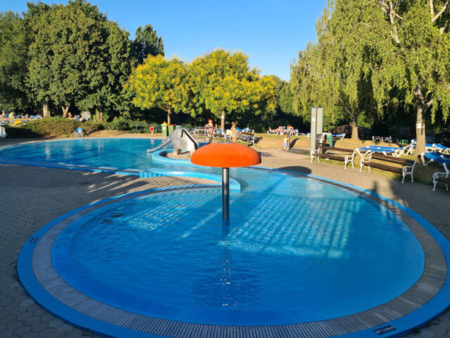 Viel Platz für den perfekten Badespaß bietet ein Erlebnisbecken mit einer Wassertiefe von 1,20 m-1,35m. Hier gibt es mehrere Wasserpilze, eine Rutsche und – unser persönliches Highlight – einen coolen Wildwasserkanal!