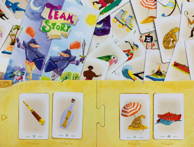 In Team Story werden alle zu Geschichtenerzähler_innen und erzählen für eine der Spieler_innen mit Hilfe der jeweiligen Bildkarten eine Geschichte. Doch dabei ist es wichtig, dass die Geschichtenerzähler_innen ihre Karten ganz genau beschreiben. Sobald die Geschichte zu Ende ist, muss nämlich der/die Zuhörer_in erkennen, welche Bilder in der Geschichte vorgekommen sind. Da ist viel Aufmerksamkeit gefragt, um gemeinsam Punkte zu machen.