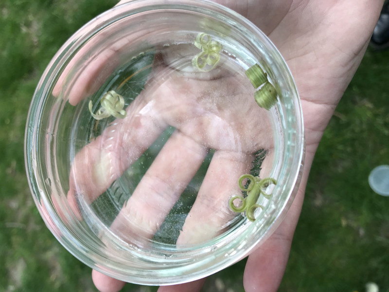 - Wenn sich die Stängel vollständig eingerollt haben oder wenn ihr findet, dass es gut aussieht, dann könnt ihr die Teile aus dem Wasser fischen.