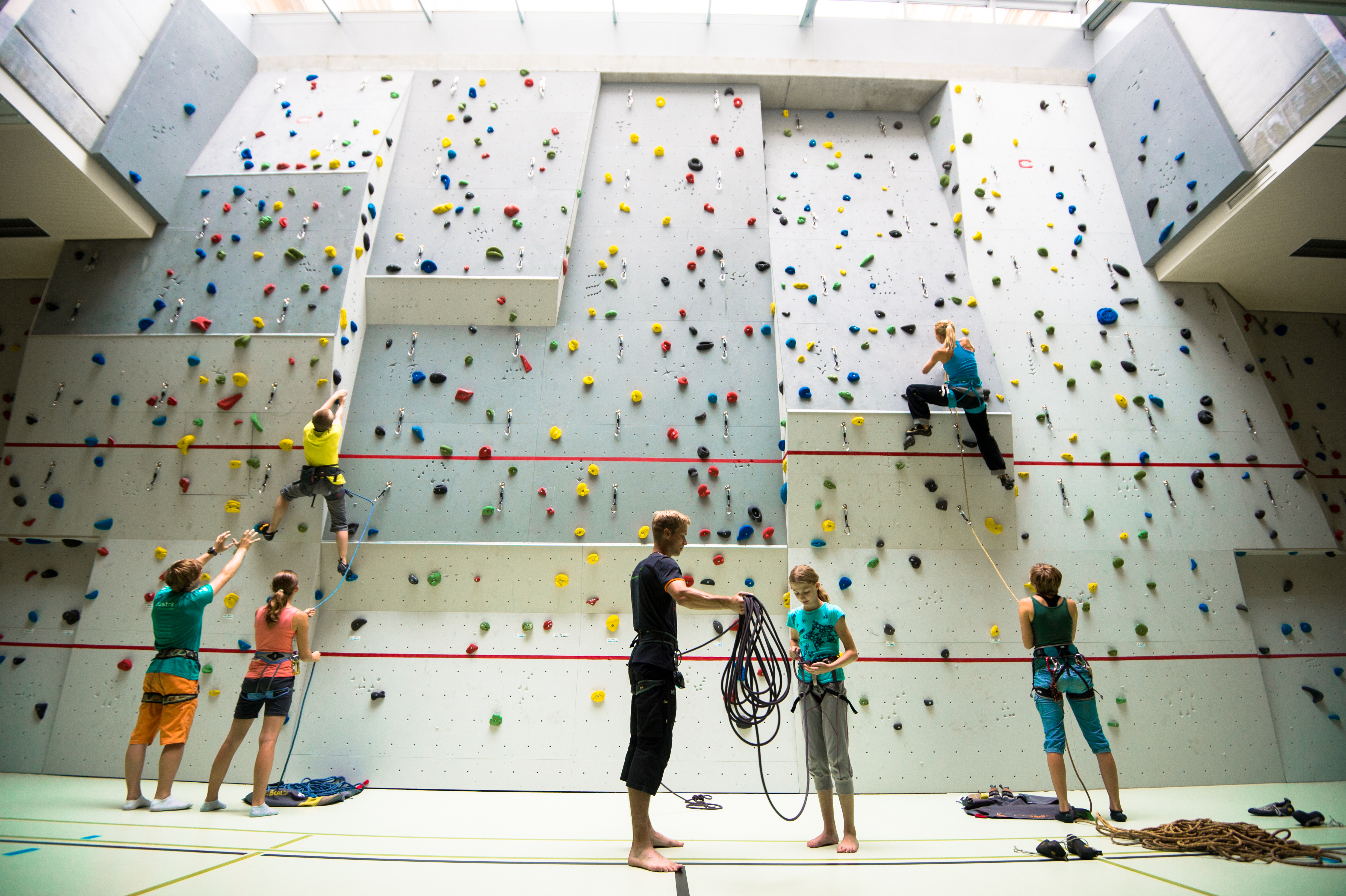 Die Kletterhalle im BORG Hegelgasse ist hell und freundlich und bot ausreichend Spielraum für uns alle. Außerdem waren in den ersten Einheiten 2 Trainer anwesend, die alle Knoten kontrollierten und auf uns Acht gaben. So fühlte sich die Sache sicher an und es konnte gleich geklettert werden. Zuerst sicherten wir unsere Kinder, dann wurde im Laufe des Kurses auch getauscht und jene Kinder, die das Sichern lernen wollten taten sich zusammen – natürlich unter Aufsicht.