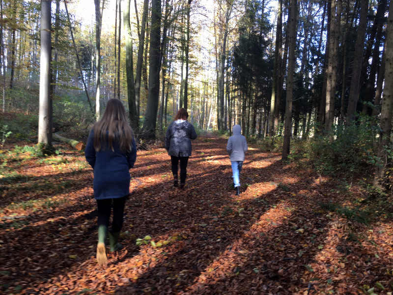 Dort sollen in der Nähe gleich 2 Verstecke sein und hier geht es schnell. Überrascht bin ich, dass das Versteck doch deutlich wo anders ist, als ich es laut GPS vermutet hätte – das mag am Handy liegen. Hier ist es eine kleine Filmdose, in der ein kleiner Block drinnen ist, wo man sich eintragen kann. Zum nächsten Cache können wir gehen. Herrlich, so eine Schatzsuche durch den Herbstwald. Und ich bin mir ziemlich sicher, dass das ohne die Anregung mittels Geocaching mit meinen jugendlichen Begleiterinnen nicht so einfach zu bewerkstelligen wäre. Beim nächsten Cache gibt es ein paar Hinweise, sodass wir das Versteck recht schnell finden – wieder eine Filmdose mit der Möglichkeit, sich zu verewigen.