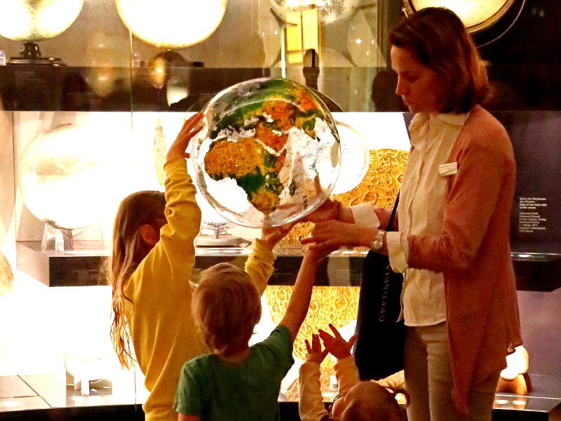 In der Ausstellung sieht man viele verschiedene Globen – große und kleine, vom Himmel und von der Erde.