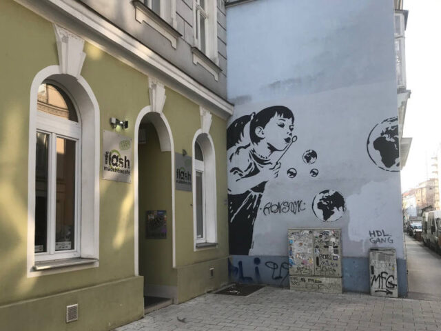 Zu guter Letzt begeben wir uns noch zu einem meiner Lieblingsgraffiti in der Zieglergasse 34, direkt neben dem Flash Mädchencafe. Der Weg dorthin dauert nur 10 Minuten und führt die Andreasgasse zurück und durch den Druchgang beim Haus 50 in der Lindengsse hindurch bis zur Ahorngasse, in die wir links einbiegen, wo auch der kleine Dorothea-Neff-Park liegt. Wir folgen der Ahorngasse bis zur Zieglergasse, wo wir rechts einbiegen.