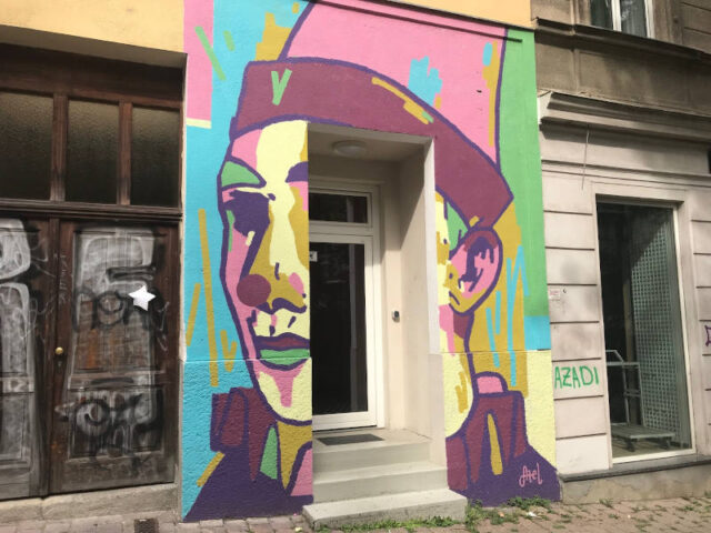 Weiter geht’s die Schadeckgasse hinauf zur Mariahilfer Straße, der wir nach rechts bis zur Kirchengasse 40 folgen, wo ihr von Broken Fingaz ein lustiges Gemälde findet. Und dann spazieren wir zur Nummer 44, die ihr in knapp 15 Minuten links erreicht. Das große berührende Wandbild dort ist beim Streetart Festival Calle Libre 2020 entstanden. Dieses Festival findet jährlich im Sommer statt. Dabei wurden schon sehr viele tolle Murals in Wien erstellt. Einen Graffiti-Spaziergang, der entlang solcher Streetart führt und dabei vier Spielplätze einbezieht, stellen wir hier vor.