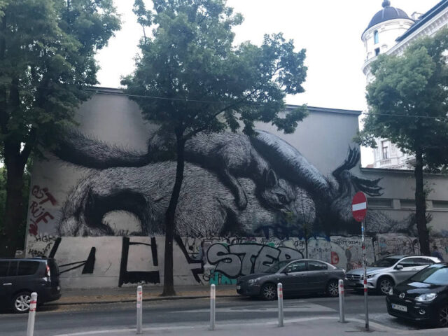 XTRA-Tipp: Wenn euch ROA auch so gut gefällt wie mir, findet ihr bei der Westbahnstraße 13 oder an der Spittelauer Lände bei Stadtbahnbögen 335 weitere Bilder von ihm. Bei Viennas First Outdoor Gallery an der Lände gibt es überhaupt viel zu sehen.