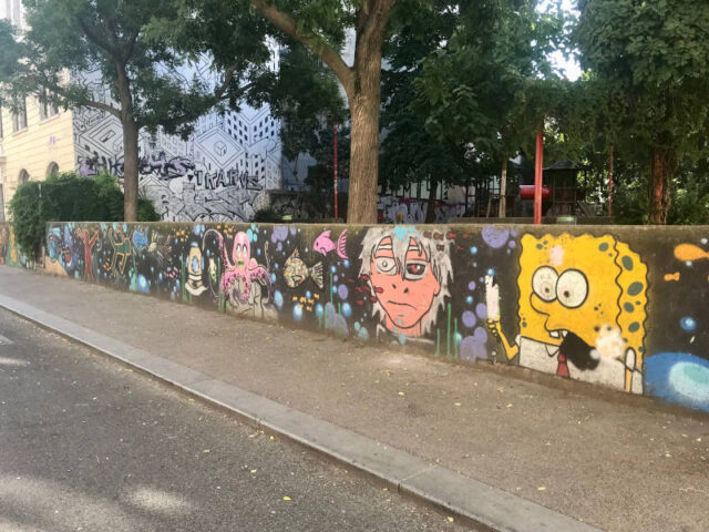 Nach knapp 15 Minuten erwartet euch die erste Spielpause im Esterhazy-Park. Dort gibt es einen sehr netten Spielplatz, auf dem ihr euch bei den Wasserfontänen auch gut abkühlen könnt. Da dort das Haus des Meeres ist, wurde die Mauer des Spielplatzes passend dazu mit Fischen verziert. Übrigens ist beim Ballspielkäfig im Esterhazypark auch eine Wiener Wand, wo ihr legal Graffitis gestalten dürft.