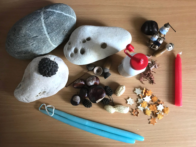 - Im Prinzip könnt ihr alles was euch gefällt verwenden: Auch Naturmaterial mit kleinen Spielzeugteilen vermischt sehen gut aus.