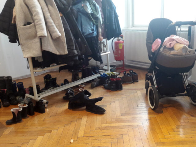 Es gibt eine Garderobe, genügend Sitzplätze zum Schuhe ausziehen, denn im Spielbereich sind keine Schuhe erlaubt und Abstellmöglichkeiten für Laufräder, Kinderwagen etc.