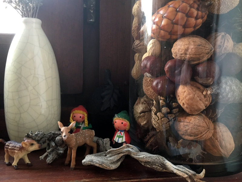 Die Kinder nahmen bei Spaziergängen immer wieder Sachen mit nach Hause und wollten die dann überall deponieren. Überall war für mich nicht okay. Also hab ich ein großes Glas gekauft, das im Wohnzimmer in einer Ecke Platz fand. Darin landeten dann Steine, Muscheln, Äste, Moos und Nüsse. Das Glas musste natürlich immer mal wieder geleert werden und so ist daraus unser Jahreszeiten Glas geworden.