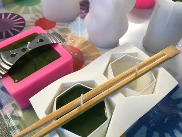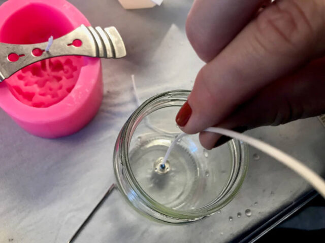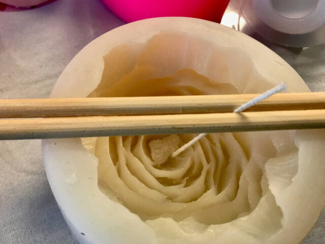 - Während das Wachs schmilzt könnt ihr die Formen vorbereiten indem ihr die Dochte anbringt und mit Stäbchen oder Dochte Halter fixiert.