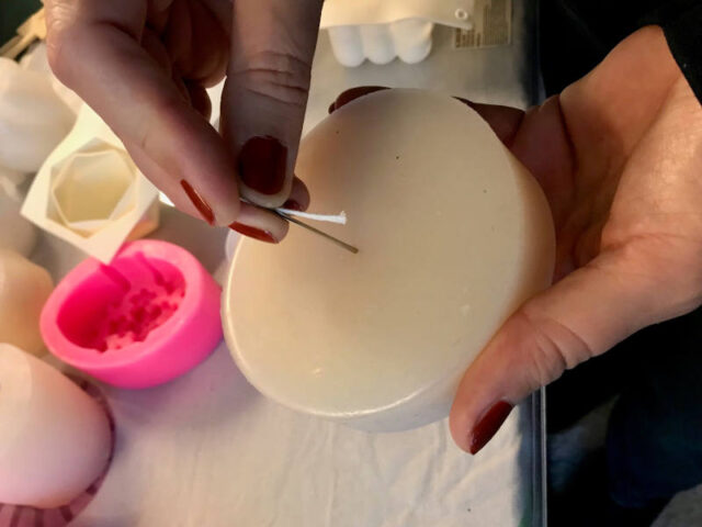 - Eine Nadel – für flache Formen ist es besser, wenn ihr einen Docht als Schnur habt. Den könnt ihr mit einer stumpfen Nadel einfädeln und durch den Boden der Form stechen.