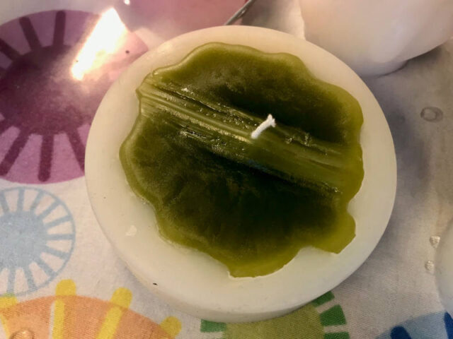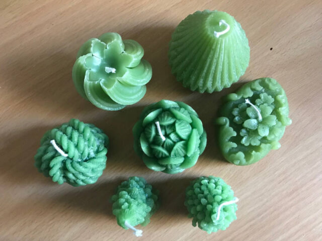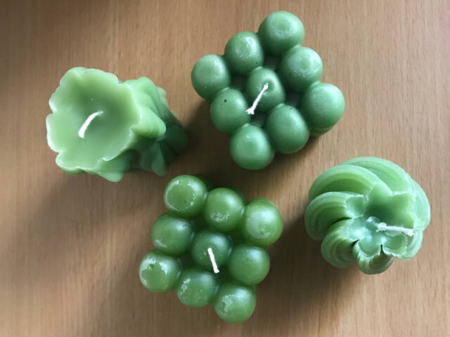 - Wenn ihr Formen verwendet habt, dann ist jetzt der große Moment gekommen, wo ihr die Kerzen daraus auslöst. Das geht meist sehr einfach, da die Formen ja aus Silikon und die Kerzen ausgehärtet sind. Allerdings kann es sein, dass sich beim Docht auf der Unterseite der Form ein wenig Wachs gebildet hat. Das müsst ihr dann erst ablösen um die Kerze gut lösen zu können. Unebenheiten am Boden der Kerze, die z. B. beim Benutzen mit Essstäbchen entstehen, könnt ihr mit einem Messer einfach wegschaben.
