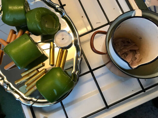 - Kerzenreste – die können einheitlich oder ganz unterschiedlich sein. Bei unterschiedlichen Kerzenresten wird die Farbe dann ein Gemisch, aber das sieht oft auch richtig gut aus. Ich habe meine Kerzen vom vorjährigen Adventkranz und vom Weihnachtsbaum mitgebracht und meine Freundin hatte noch Teelichter.
