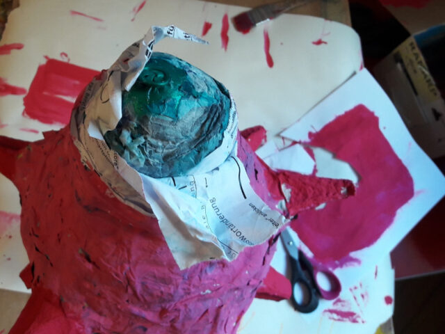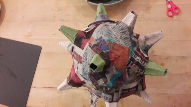 Wichtig ist, dass ihr genügend Trockenzeit einrechnet! Bei uns haben die Bastelarbeiten alles in allem eine Woche gedauert. Außerdem solltet ihr die Pappmaschéschicht nicht zu dick machen, sonst dauert es ewig, bis sie aufplatzt. Anleitungen gibt es ganz viele im Netz zum Beispiel diese. Wir haben für die Spitzen Eierkarton verwenden.