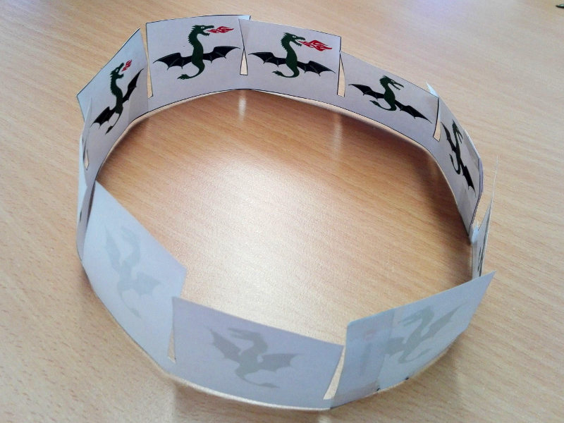 - Zum Schluss fehlen nur noch die Bilder. Für eure erste Wundertrommel empfehle ich die Bastel-Vorlage von der geolino-Seite mit dem feuerspeienden Drachen. Ihr könnt sie ausdrucken, ausschneiden und so zusammenkleben, dass ein verbundener Ring entsteht.