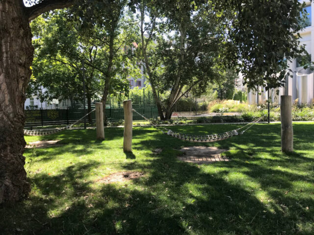 Ich musste ein Buch aus der Bücherei im 3. Bezirk holen und bin dabei auf diesen wirklich winzigen Park gestoßen. Er liegt ein bisschen versteckt und bietet Raum um sich kurz zu entspannen. Hängematten und eine runde Bank in einer kleinen grünen Hinterhofoase laden zum Durchatmen ein. Die Holzschafe dürfen als Reittiere dienen und wurden gerade von Kindern bespielt. Einfach nett!