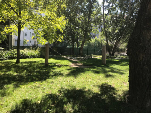 Eine beschattete Pergola mit vielen Bänken, ein kleines Klettergerüst mit breiter Rutsche auf der Wiese, eine Netzschaukel und eine Sandkaste, das ist es schon fast. Ein hoher Kletterturm mit geschlossener Rutsche erfordert schon ein bisschen mehr Mut und auf dem Boden sind alte Straßenspiele wie z.B. Tempelhüpfen aufgezeichnet und laden zum Bespielen ein.