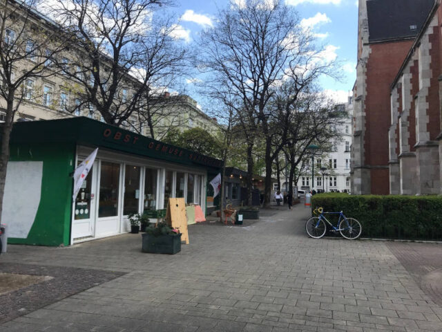 Ein Bücherschrank, viele Bänke und neuerdings auch transportable Sessel, Grätzlsitz genannt, laden zum Verweilen ein. Ein paar Spielgeräte, Trinkbrunnen sowie ein Öklo runden das Angebot ab. Und beim Markt ein bisschen versteckt hintern Hecken gibt es auch einen Tischtennistisch. Also wirklich ein nettes Platzerl, und das alles direkt neben dem Radweg.