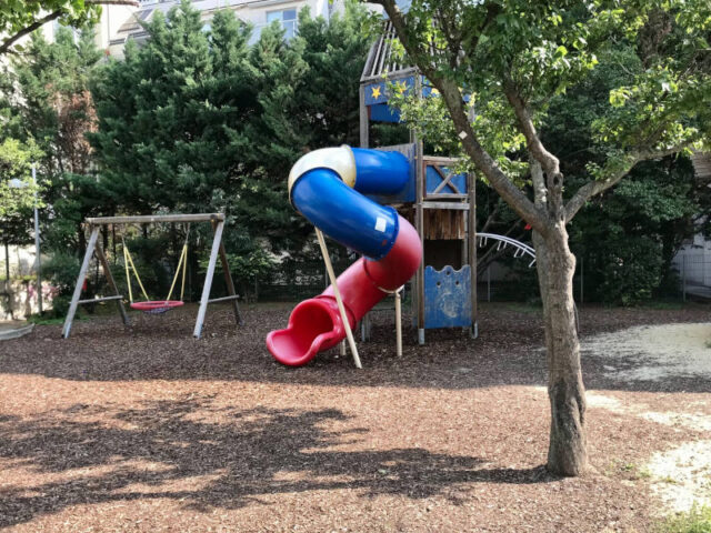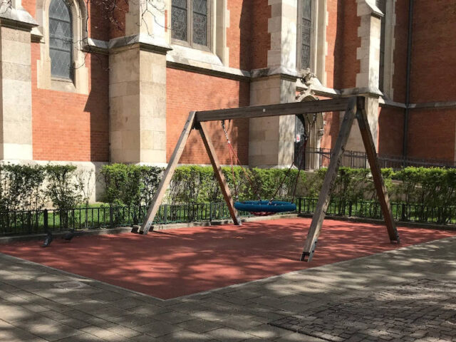 Die Kleinkinder-Spielgeräte stehen nahe beieinander lediglich die Netzschaukel ist ein bisschen abseits, direkt neben der Kirche. Ganz in der Nähe ist auch ein Kletterturm mit Rutsche.