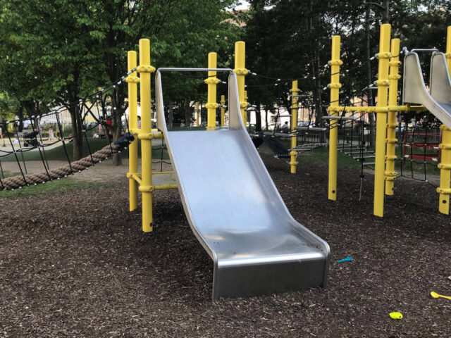 Es gibt auch noch Schaukeln, eine davon für Kleinkinder, zwei Rutschen und eine Sandkiste. Der Park liegt zwar direkt neben der Straße, aber da es eine kleine Nebenstraße ist, ist meist nicht viel Verkehr, wie mein Freund meinte. Natürlich gibt es einen Trinkwasserbrunnen und ein öKlo ist direkt beim Eingang.