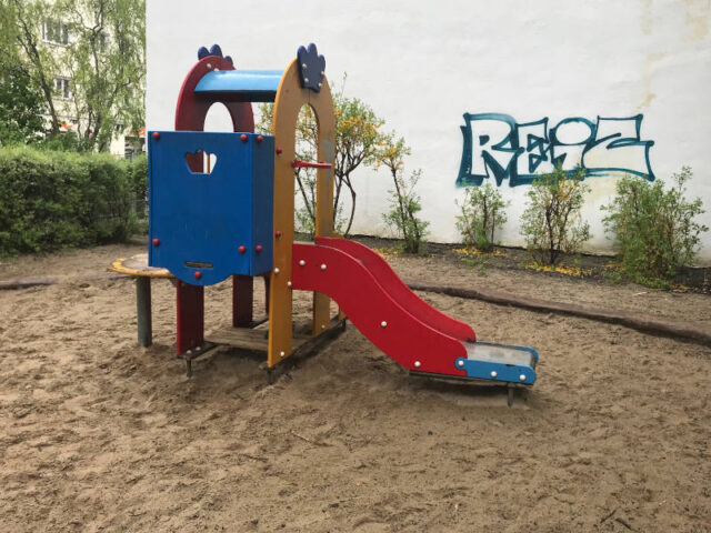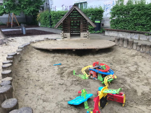 Der Spielplatz schmiegt sich an der anderen Seite an die Häuserfront und ist eingezäunt. Direkt beim Eingang ist auch ein Trinkwasserbrunnen. Eine große Sandkiste, eine Kleinkinderschaukel und eine für größere Kinder, Reckstangen und ein Gummiwackelband, eine kleine Rutsche und ein Wackelgerät, das
