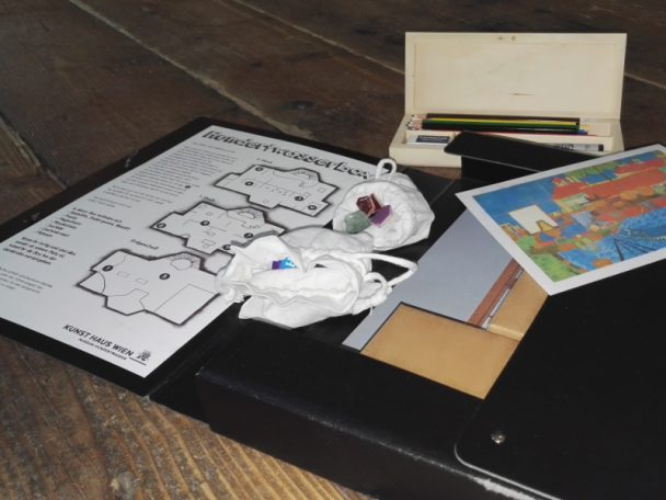 Für einen Museumsbesuch ohne Führung gibt’s bei der Kassa die Hundertwasserbox! Diese ist ideal, wenn man mit Kindern das Hundertwasserhaus eigenständig erkunden will. Sie enthält kindgerechte Infos über Hundertwasser und kreative Anleitungen für die Entdeckungstour. Mit Puzzle, Zeichenkreisel, Buntstiften, Mosaiksteinen und Heft ausgestattet malten die Kids Spiralbilder, gestalteten ihr persönliches Mosaikfenster und erfuhren, warum Hundertwasser Bäume auf Dächer pflanzen wollte. Es gibt noch weitere Anleitungen, die wir mit den Kindern durchführten, aber alles möchte ich nicht gleich verraten.
