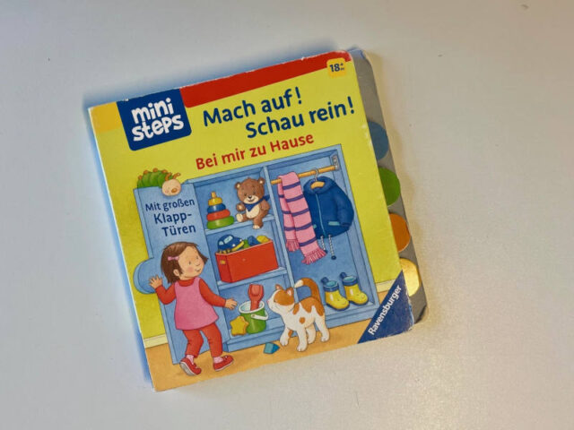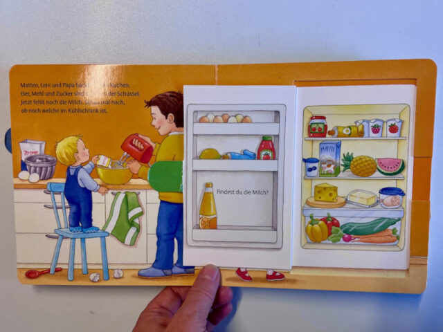 Bei diesem Mitmachbuch gefällt mir, dass auch die zu öffnenden Felder stabil sind und nicht so schnell kaputt gehen. Außerdem sind im Text Fragen formuliert, damit das Kind etwas Suchen oder Benennen kann.
