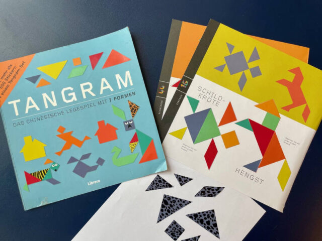 Wir hatten auch wirklich viel Freude mit einem Tangram-Set von Libero, das leider viel zu schnell ausgeklebt war. Laut Amazon ist es für Kids ab 3 Jahren, was ich allerdings nicht bestätigen kann, zumindest nicht, wenn das Kind es alleine macht.