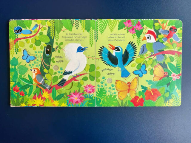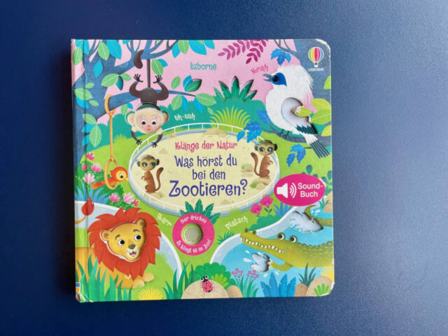 Bei diesem Mitmachbuch geht es um Töne. Es ist Teil der „Klänge-der-Natur-Reihe“ von dem es ganz unterschiedliches zu hören gibt. Bei unserem Buch geht es um den Sound im Zoo. Durch das Drücken eines Knopfes wird der Ton aktiviert. Zusätzlich gibt es in diesem Pappbilderbuch auch Tastelemente, sodass der passende Spundknopf erst gefunden werden muss.